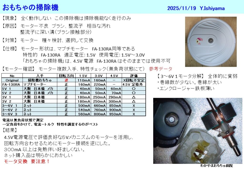 おもちゃの掃除機、モーター不良で交換。種々モータ取り寄せて評価、最適なのを選びました。形状はマブチモータ FA-130 同等品ですが、これだけ大きい差があるとは正直驚きです。交換時は要注意!!本来、モータ特性は一定負荷を与えての特性チェック必要ですがその環境ありません。とりあえず無負荷でチェック、なお、データに記載ありませんが手で挟んで状況は見ています。電流多いモータを分解、一目で貧弱なのがわかりました。